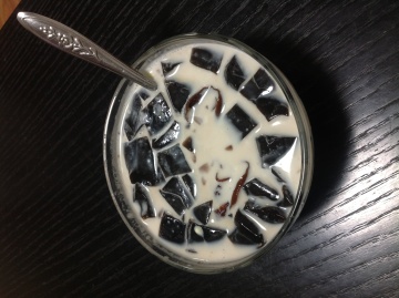 3、成了冻冻的烧仙草拿出来切成小块,加少许牛奶一起放入碗中,也可以加一些蜜饯提味,我加的是在云南买的木瓜蜜饯,这次去云南买了一些美食。