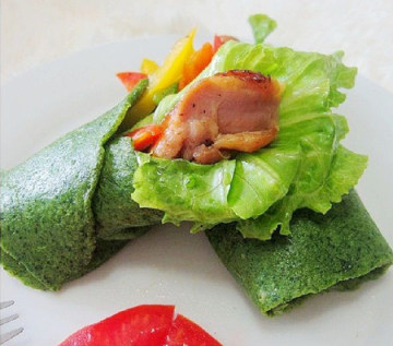 菠菜100g、清水150g、鸡蛋1个、面粉35g、油适量、盐适量、鸡腿1个、生菜适量、彩椒适量