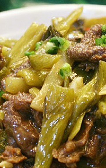 主料:腌牛肉250克,酸菜茎薄片200克,以葱白,辣椒,蒜茸为配料,油味料等适