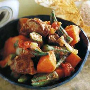 橄榄油3茶匙,瘦羊腿肉454克,去掉可见脂肪,切成约2厘米见方的小块,中等大小的洋葱1个,剁丝,大蒜4瓣,剁碎,罐装碎番茄180克,红薯454克,去皮,切成2厘米见方的小块,幼滑花生酱2汤匙,盐1茶匙,红辣椒粉(cayenne)1/2茶匙,秋葵280克