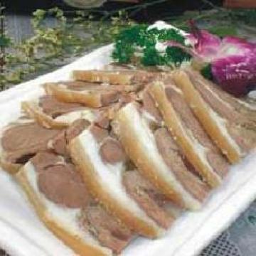 2.锅内加老卤及葱,姜,黄酒,盐及适量清水,烧开撇去浮沫,羊肉入锅,上置竹架,用重物压住,不使浮起。开锅后撇去污油,留净油封住汤面,停火焖三四小时,待汤温降至30-40度时起锅。