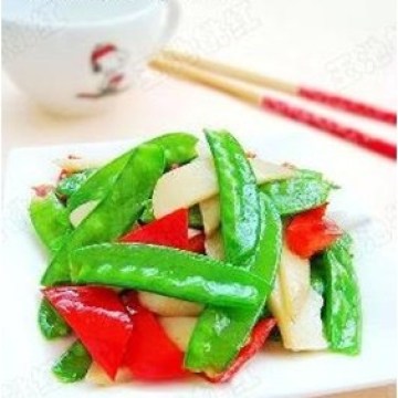 5.荷兰豆和红椒块,快速翻炒,加入盐、白糖、生抽翻炒均匀,最后加鸡精即可