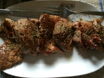 1、将猪腰肉切成适中大小的片状,装入大碗,加入橄榄油、适量糖、盐、淀粉、两撮黑胡椒、一撮白胡椒、少量迷迭香与香草叶,加入少量水和淀粉,拌匀,用保鲜膜封盖,放冰箱静止一个晚上。