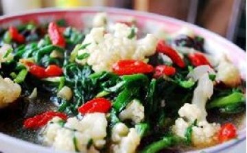 3、韭菜软了,菜花熟了,就用水淀粉勾芡,加盐调味,洒上事先泡好的枸杞,出锅。