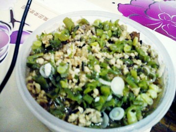 6、将刚炒好的肉末连同油淋在葱花上即可。