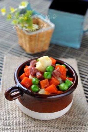 春笋,胡萝卜,新鲜豌豆,火腿,料酒,盐,鸡精