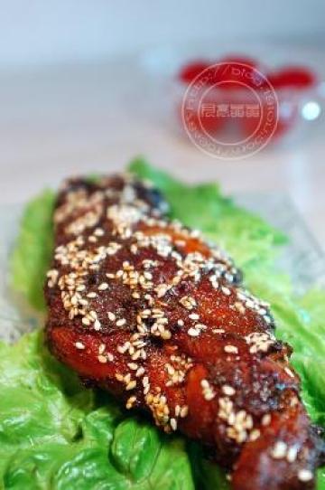 6.取出兔腿正面朝上抹油,撒上孜然,白芝麻,继续烤10分钟,取出兔腿,刷层蜂蜜,再烤10分钟上色