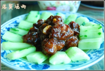 8、再钩上薄芡,让炸好的肉条在浓浓的醋汁里翻炒一下,倒在黄瓜拼好的盘子中央。