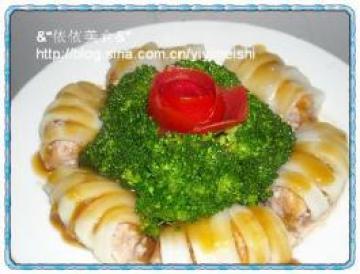 6.上开水锅里大火蒸10分钟,倒出汁液备用,中间加入灼过水的西兰花摆盘,中间放一朵番茄皮花