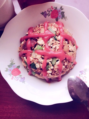 10、饭煮好后,将炒好的鸡蛋、黄瓜倒入搅拌,盛入小碗中,倒扣在盘中,挤上番茄酱即可食用。