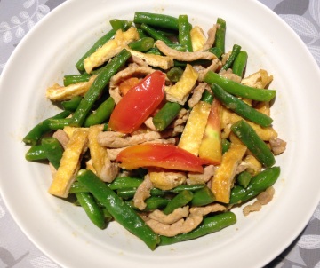 5、锅中加油,把猪肉用料酒、酱油炒一下,加入云豆一起炒,再加一些水,盖上锅盖,煮3~5分钟。