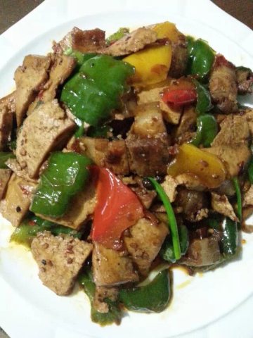 2.爆炒:少许食油入锅,油温升高后,将切好的肉片入锅翻炒,在肉片卷起时,放入豆豉、郫县豆瓣,同时将早已切好的青椒一同入锅翻炒,随后放入少许精盐、砂糖,待出锅前放少许味精。