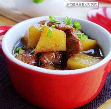 7.待沸再转小火将肉焖烧至熟烂,加土豆,用中火烧至稠浓卤汁,淋入少量熟油,就可起锅装盘。