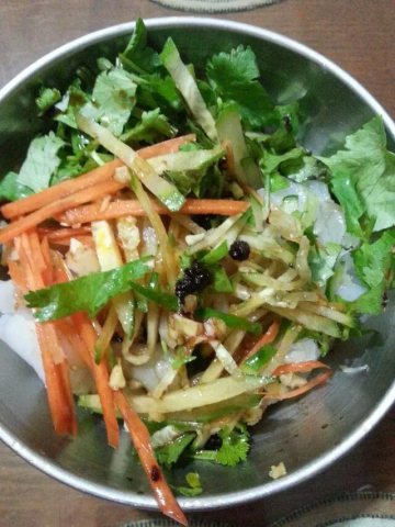 2、黄瓜、胡萝卜切丝,香菜、蒜头切末,蒜末、香醋、生抽、花椒油、花椒粉、糖、鸡粉、自制辣椒油、自制香辣麻酱、老干妈豆豉酱、熟白芝麻、花生酱、芝麻酱,把以上所有调味料调制均匀。