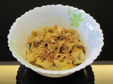 2、冷凍小餛飩8顆和麵條1人份煮熟撈入小碗。