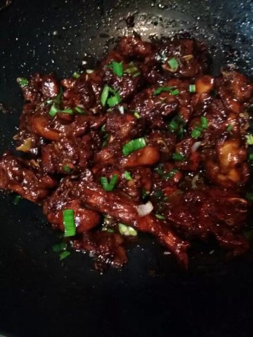 6、最后加糖收汁,淋上些柠檬汁,撒上大蒜叶碎即可出锅装盘!酒香和柠檬香夹带着麻辣味的兔肉做好了,有没有想吃的!哈哈!