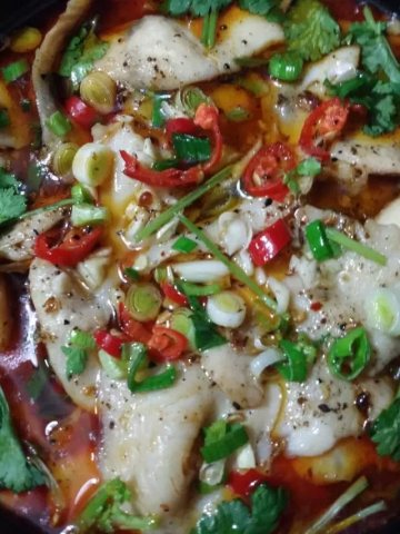 9、鱼片煮开后1-2分钟,关火,全部倒入盆中,把锅洗干净,倒油大概1斤(估计的),烧热,再放上图一的花椒,干辣椒(2。3斤的鱼,干辣椒1两,花椒半两)炸香后,直接淋在盛鱼的盆里即成。