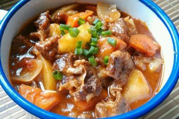 主料:牛肉(牛腩)1千克、土豆2个、西红柿4个、洋葱2个、胡萝卜1个、姜、葱。