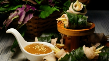 步骤4.如果你的肉片油脂比较多,建议可以用5-6片红凤叶包裹肉片,可以降低油腻感。姜丝请选用嫩姜,才不会太辣,也好入口。