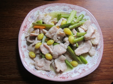 2、起油锅炒切段芦笋和白果2分钟,放入肉片。