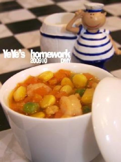 虾仁50克,胡萝卜50克,青豆40克,甜玉米粒50克,鸡蛋清20克,糖1小匙,盐适量