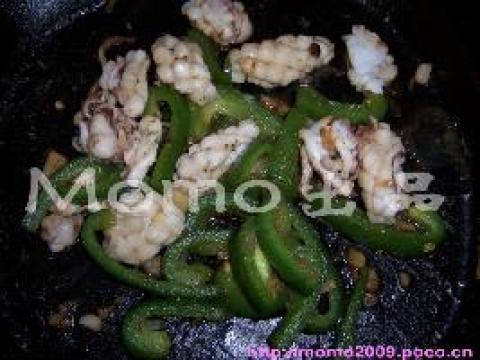 2.锅内放少量油,烧热后加入鱿鱼炒至七成时加入青灯笼椒。