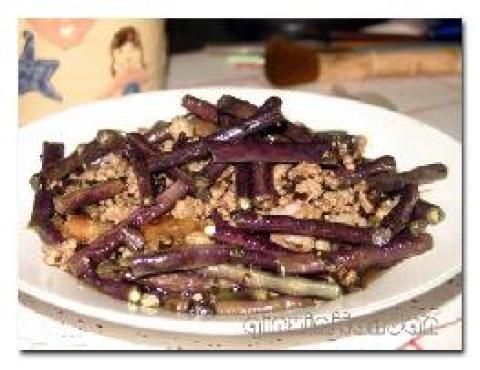紫豆角250克,肉松适量,肥肉适量,榄菜适量,蒜适量,生抽适量,鸡精适量,糖适量