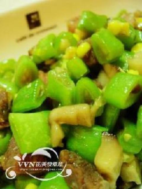 3.再放入玉米和冬菇丁,最后放入四季豆,再加调料一起翻炒至熟即可出锅。