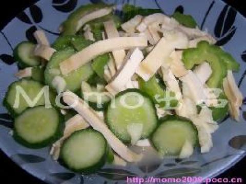 1.苦瓜洗净后去囊切丝;青瓜洗净切片;豆干洗净切丝;灯笼椒洗净切丝。