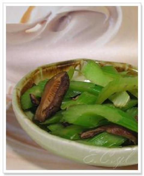 1.干香菇在热水中泡发(水里放一点盐保持香菇的味道)切丝, 芹才切细段。
