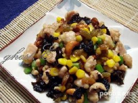 鸡肉,鸡精,淀粉,木耳,青菜梗,腰果,玉米粒,葡萄干,盐,料酒,糖,姜汁