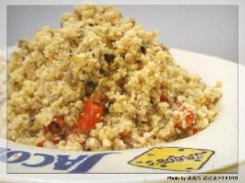主料:豆渣一小碗,配料:腿肉2两,蒜两瓣,红辣椒两个,香葱适量,调料:盐,生抽,鸡精