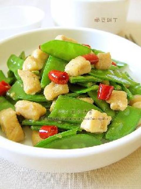 5.锅中留底油,放入辣椒爆香,放入荷兰豆,鸡丁,快速翻炒,加入盐,鸡粉调味炒匀入味,用水淀粉勾薄芡,淋明油,即可出锅。