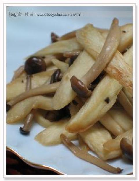 2.锅里放少许油,油热后放蟹棒菇,中火炒两分钟后再放茭白,火可以转大一点,炒到蟹棒菇和茭白都比较软了的时候放盐。