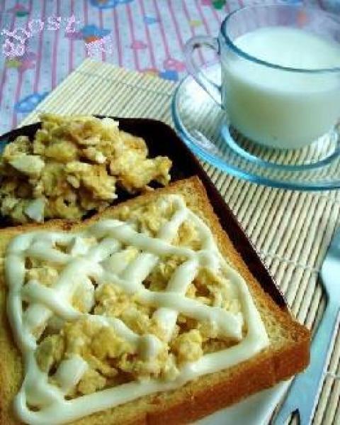 2.将上述蛋液入油锅炒熟,铺在土司上,挤上沙拉酱即可。