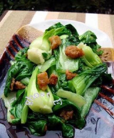 2.热油锅,倒少许油,煸炒青菜并倒入猪油渣,加盐、鸡精调味即可。