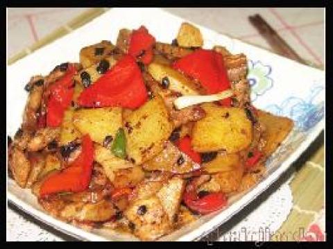 五花肉250克,马铃薯1只,辣椒适量,葱适量,油豆豉适量,蒜适量,盐适量,生抽适量,糖适量,料酒适量,鸡精适量