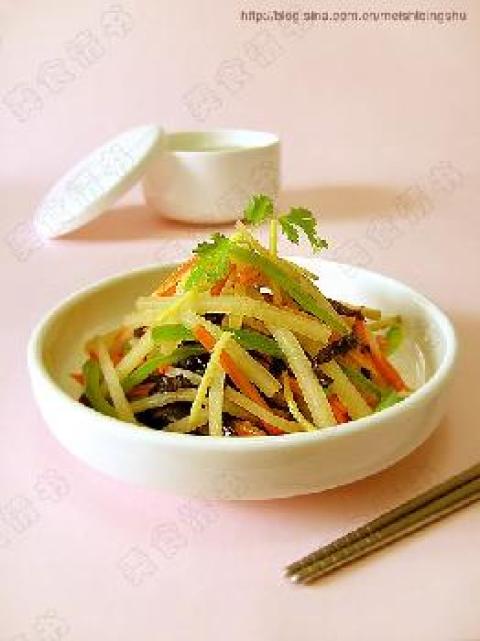 2.将水芥、胡萝卜、青椒、木耳分别切成丝,不必切的太细,但要尽量切的均匀。