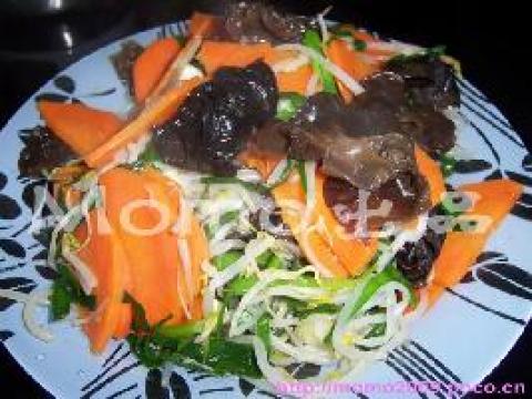 2.锅内放少量油,烧热后加入胡萝卜和木耳翻炒。