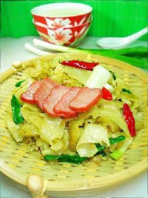 豆丝2张,大蒜叶,叉烧肉