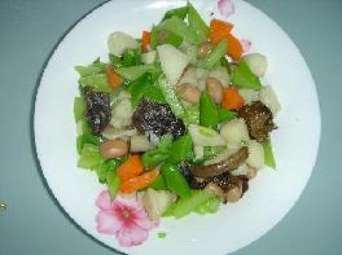 芹菜,青豆,马蹄,胡萝卜,木耳,花生,葱,姜,色拉油,盐,糖,鸡精,八角