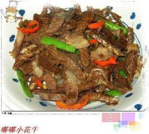 3.锅内倒油,把猪肉炒香,加入泡好的芦笋干,青红辣椒翻炒;加酱油、盐、糖调味~~