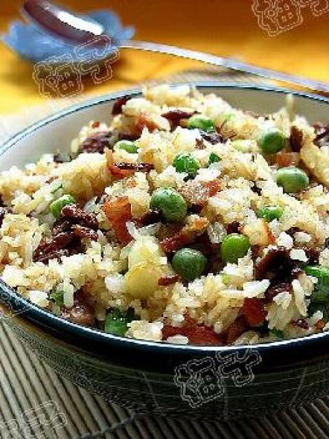 饭,姬松茸,油,蒜蓉,培根,豌豆,蒜,盐,酱油,香油