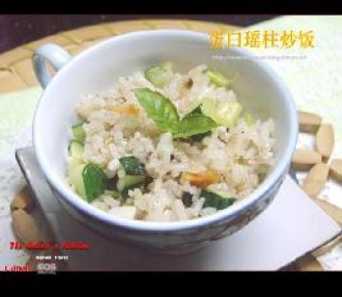 3) 炸瑶柱丝的余油热后,下葱白丁炒香,然后放白饭大火炒2分钟,加蛋白,胡萝卜丁和调料,翻炒几下后拌入瑶柱丝即可。