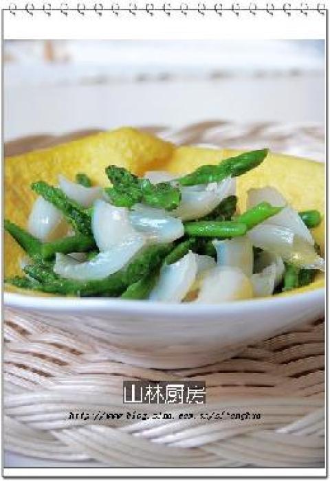 3.取一不沾锅放油后爆香蒜片,放入芦笋、百合、白果拌炒均匀,调味后即可盛盘。