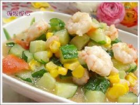 虾仁,黄瓜,西红柿,玉米,山芋粉,盐,味精