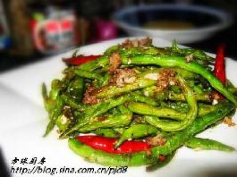 豆角500克,花椒20克,肉末,花生碎,姜少许,蒜少许,干辣椒20克,食盐,油