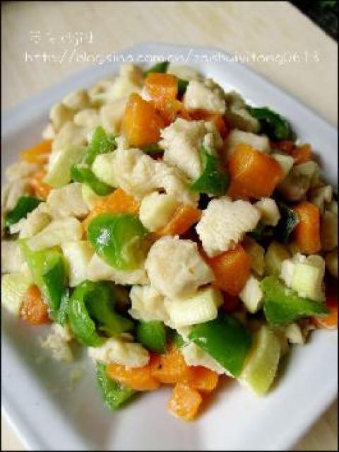 4.待鸡丁变白色后,倒入茭白和胡萝卜翻炒,最后倒入青椒炒匀。加盐,鸡精调味即可出锅。