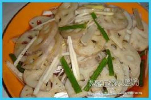 2.藕片装盘,加盐、胡椒粉、鸡精,糖,少许醋、香油,上面盖上葱丝,浇上烧热的油,拌匀,即可,香脆开胃。