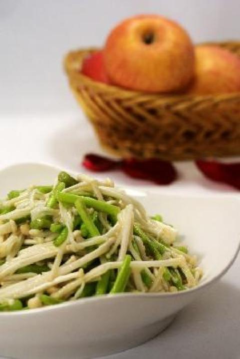 2.锅内放少许油,油热后先下芦蒿翻炒几下,再下金针菇,加少许盐和白糖,旺火急炒15秒(金针菇半熟状)即可出锅装盆。